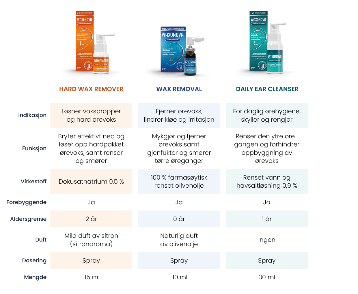 Waxonova ørespray gjør det enkelt å ta vare på ørene dine i mange situasjoner. Du velger den som passer deg for øyeblikket – eller kombinerer flere for en god ørepleierutine. Profesjonell kvalitet. Trygg følelse. Sunne ører.